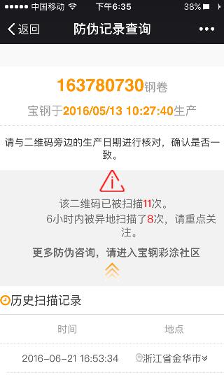 圖中的二維碼,就是我們接下來(lái)要說(shuō)的重點(diǎn)了。鋼板卷背面的二維碼可以通過(guò)第三方的二維碼掃描軟件,或是微信掃一掃直接掃描。掃出來(lái)的內(nèi)容會(huì)直接顯示鋼廠標(biāo)識(shí),鋼卷的捆包號(hào),鋼卷的生產(chǎn)時(shí)間,比對(duì)方式。同時(shí)內(nèi)容里還會(huì)顯示鋼卷的掃描地點(diǎn)(使用地點(diǎn)),比如此鋼卷在江西、湖南、湖北任何一個(gè)地方的使用地點(diǎn)。當(dāng)然也會(huì)顯示掃描的時(shí)間和掃描次數(shù)。最主要的就是二維碼每掃描一次寶鋼的系統(tǒng)里面都會(huì)有相應(yīng)的記錄。比如在什么時(shí)間,什么地點(diǎn)曾經(jīng)此鋼卷被掃描過(guò)。如果您買的鋼卷掃描后看到此鋼卷在您不知道的地點(diǎn)被掃描過(guò),那可能就不一定是真貨了。